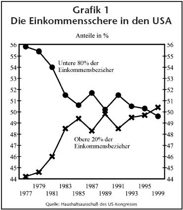 Schauen wir uns an, was unter diesen Bedingungen mit den unteren 80 Prozent der Familieneinkommen in den USA geschehen ist (siehe Grafik 1). Das sind nur die offiziellen Zahlen, in Wirklichkeit ist es viel schlimmer.