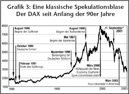 Nach den Krisen von 1997-98 - die sog. Asienkrise, die russische GKO-Krise, die LTCM-Krise - verlegte man sich in Absprache mit dem Spekulanten und Drogenfreund George Soros auf die Politik, die manchmal als "eine Mauer aus Geld" bezeichnet wird: Um das System zu retten, werden Unmengen von Geld ausgegeben und in das System gepumpt. Das erreichte im Frühjahr-Sommer 2000 einen kritischen Punkt: Seitdem wächst die Geldmenge schneller an als die Summe der Finanztitel. Damit begann der Crash an den Finanzmärkten (siehe auch Grafik 3).