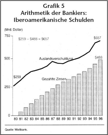 Wenn man die Kredite dieser Länder seit 1971 mit dem vergleicht, was sie im Laufe der Jahre bezahlt haben, sind sie eigentlich keinen Cent mehr schuldig. Sie haben schon das Mehrfache der Kredite zurückgezahlt (siehe Grafik 5). Heute wollen IWF und Weltbank aus Argentinien, Brasilien und