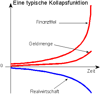 Betrachten wir zuerst die Typische Kollapsfunktion, die ich zum ersten Mal 1995 auf einer Konferenz im Vatikan über Fragen des Gesundheitswesens als pädagogisches Hilfsmittel benutzt habe. Die obere Kurve beschreibt die Entwicklung der Finanztitel im System. Die mittlere Kurve beschreibt die Entwicklung der Geldmenge, die aufgewendet werden muß, um das Wachstum der Finanztitel aufrecht zu erhalten. Die untere Kurve steht für die realwirtschaftliche Produktion der Wirtschaft, gemessen in physischen Werten pro Kopf und pro Flächeneinheit. Diese untere Kurve ist rückläufig (siehe Grafik 2).